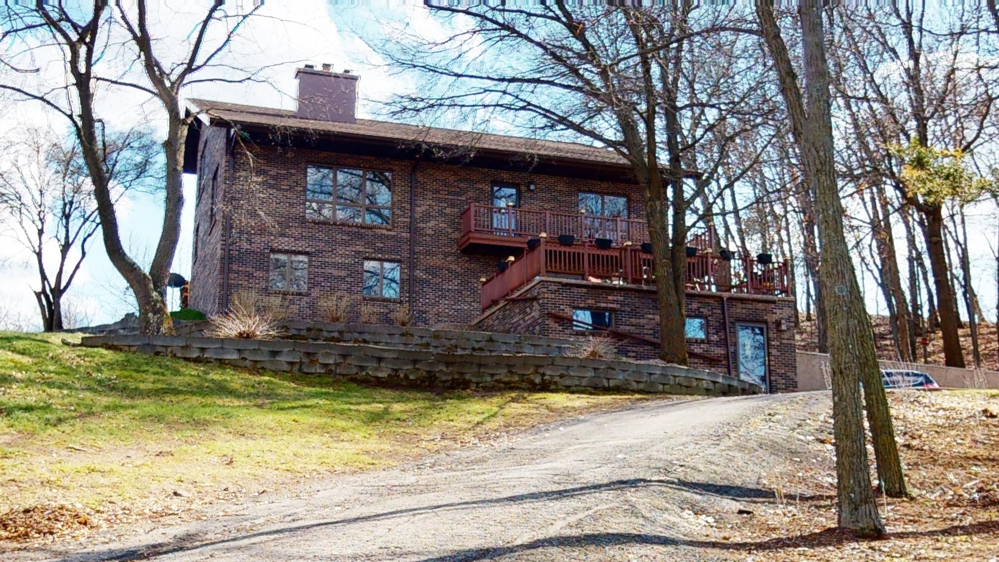 Secluded all brick home! Custom built walkout 2 story home, w/wrap around maintenance free deck to enjoy the 360 degree city & bluff views. 17 foot ceilings w/beamed exposed trusses, 2 story brick wood burning fireplc, 3 family rms. Kitchen w/granite countertops, stainless steel appliances, a beverage station, & a cubby that would make a great walk-in pantry. Ceramic tile in kitchen, laundry, & baths. Formal din rm, & 2nd floor loft w/3 bdrms full bath, office, & family room. Large master bdrm w/walk-in closet & full bath nearby. A front patio above the 2.5 car garage & a rear patio that is wired for a hot tub. Whole home security system for monthly fee. Seller will pay 1/2 of total estimate to re-seal coat patio above 2.5 car garage. Property is zoned R3, can be duplexed or tri-plexed.