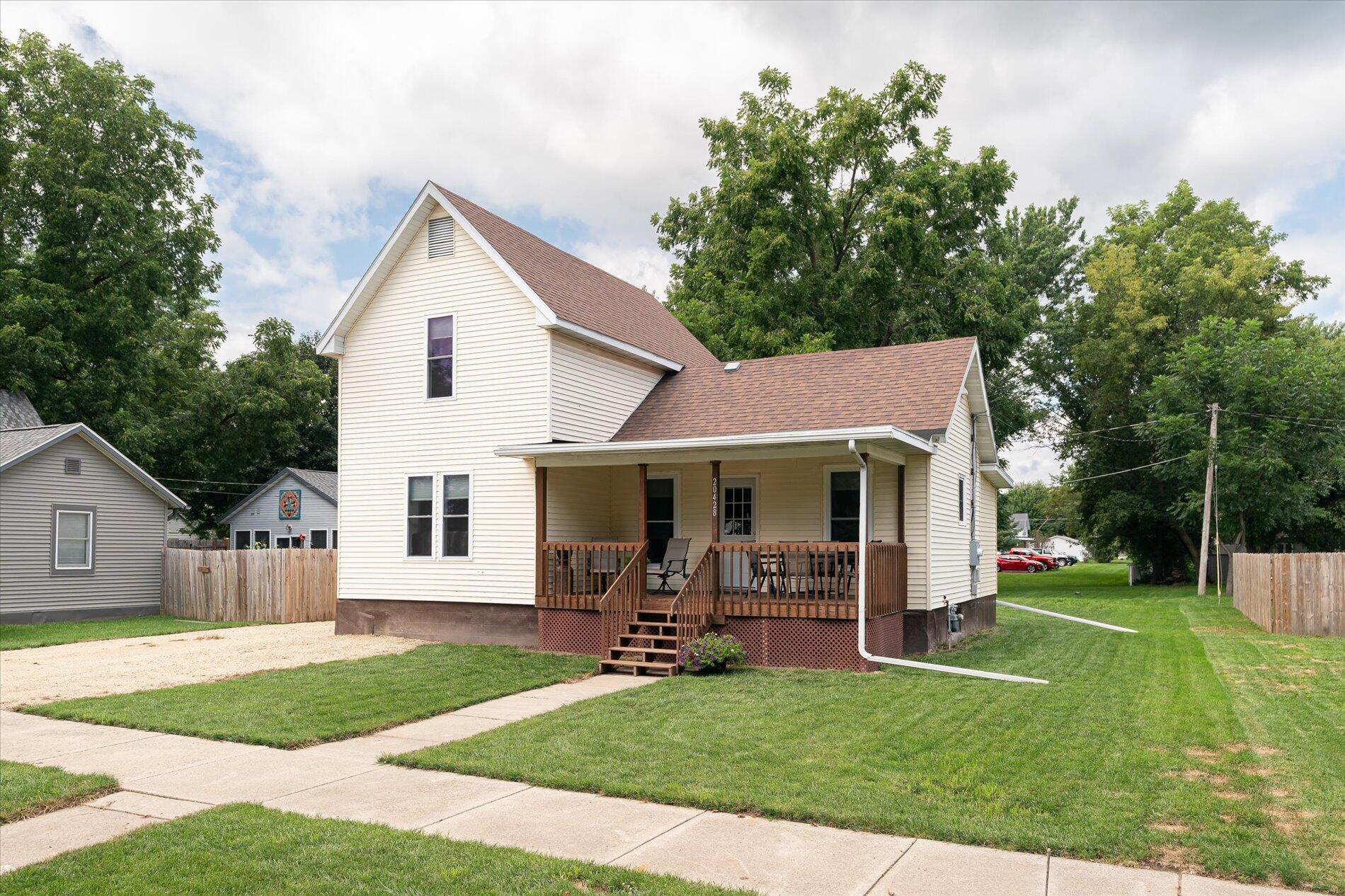 Beautiful Farmhouse style home with all the modern updates. 3 bedrooms, 1 bathroom and main floor laundry. Large galley kitchen with contemporary white cabinets. Spacious rooms with high ceilings. Cozy covered front porch is the perfect place to relax. Huge yard allows room for a future garage. New shed in the back for extra storage. Property is across from the park, near the grade school and not far from the lake.