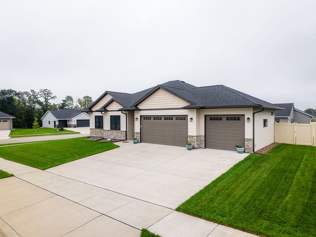 Beautiful 4 bedroom, 3 bath ranch in Holmen's Cole Addition! Built in 2022, this home offers 1,864 sq. ft. on the main level with an open floor plan, south-facing windows, and a fireplace. The kitchen features Amish cabinets, quartz countertops, a large island, walk-in pantry with outlets, gas range with hood, and reverse osmosis water. Primary suite includes a walk-in closet, dual vanity, and tiled walk-in shower. Finished lower level adds a spacious family room, wet bar, bedroom, bath, and flex space. Enjoy a heated 3-car garage, irrigation, fenced yard, deck, and patio. Less than a 1/4 mile to Halfway Creek trail and connects to Halfway Creek Park. Less than a mile to restaurants and 1/2 a mile to Remington Hills Park.