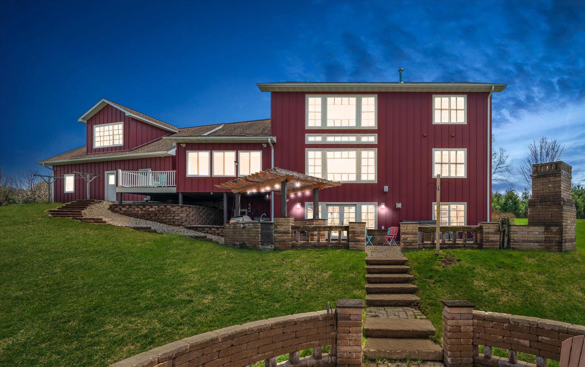 One of the most exquisite executive compounds ever offered in Southwest Wisconsin! This luxurious 6,290 sq. ft. custom home sits atop 105.5 ridge-top acres in Richland County with panoramic bluff views. Featuring 5 beds, 6 baths, a gourmet kitchen with Amish-built hickory cabinetry, walnut bar, and high-end furnishings throughout. A heated 3-car garage, finished bonus room, and expansive patio with outdoor kitchen offer comfort and entertainment. Sportsman's paradise includes a 2,000 sq. ft. heated shop with solar, car lift, and walk-in cooler. Trophy whitetail, spring, stream, and a network of trails make this property a rare gem. Land includes 22+/- acres of tillable ground, mature timber, and food plots. Fully furnished and meticulously maintained. Once-in-a-generation estate.