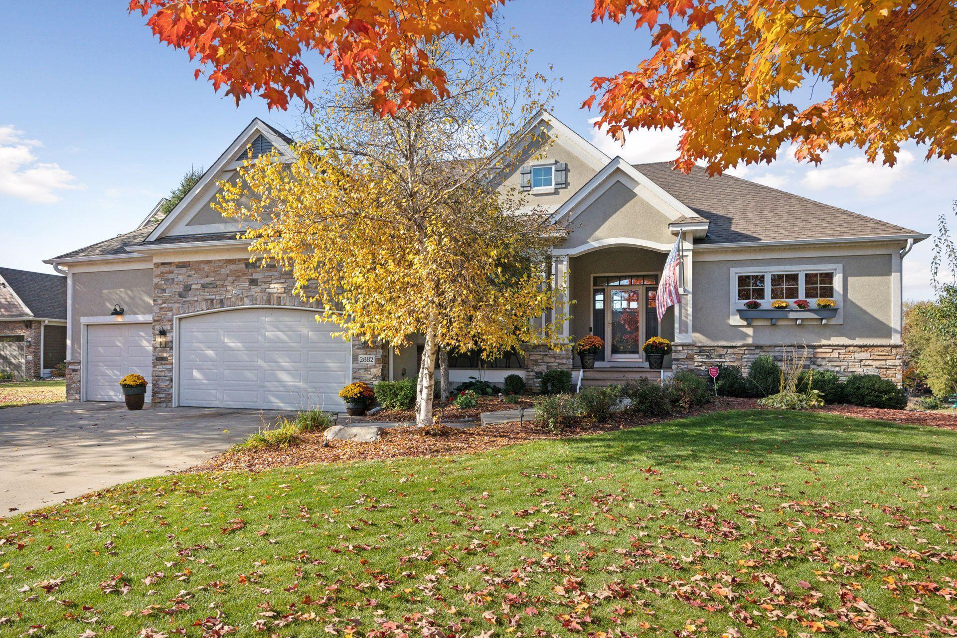 Nestled in the serene enclave of The Lakes at Northwest Shores, the home offers an unparalleled blend of elegance, comfort, and natural beauty. This former Hanson Builders model home, built in 2004, spans an expansive 3,574 square feet on a generous 0.36-acre cul-de-sac lot, with 4 beds, 4 baths, and a host of upscale recent upgrades that make it truly stand out. Step inside to an open-concept main level flooded with natural light, where a cozy gas fireplace anchors the living space, perfect for chilly Minnesota evenings. The gourmet kitchen dazzles with stainless steel appliances and granite counters and flows seamlessly into a sunlit dining area. Retreat to the luxurious primary suite, featuring a spa-like en-suite bath, or unwind in one of the three additional bedrooms, each with ample closet space. Main floor laundry room lets you take care of the chores easily without extra steps to the lower level. Outside, your private oasis awaits with breathtaking western exposure and sunsets overlooking the tranquil Sunrise Lake and a quiet city park. Enjoy 84 feet of pristine shoreline, a beautifully landscaped yard, and an inviting firepit—ideal for summer barbecues or stargazing. The exterior blends timeless charm with durable stone, stucco, and brick accents, complemented by a 3-car attached garage for effortless storage. Located in Blaine's sought-after Northwest Shores, you're minutes from top-rated schools, shopping, and easy access to 35W for a quick commute to Minneapolis or St. Paul. Embrace lakeside living at its finest—where every day feels like a vacation up north.