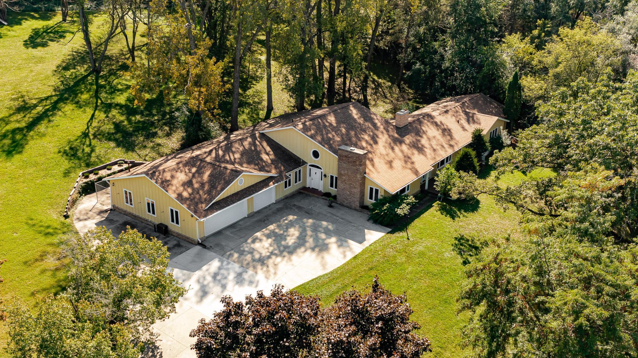 Very charming large rambler on 2.98 acre wooded and panoramic lot. Country living near town, schools, shopping and walking trails. Pre inspected, well kept home, in-move in condition with 5 bedrooms and 5 bathrooms, wood floors, beautiful parquet wood floors, tall ceilings, 2 fireplaces, lots of built in cabinetry, wrap around decks, large covered deck. Extra large 1120 square foot, 3 car heated attached garage with storage cabinetry and epoxy floor. The large 3596 square foot main floor features: access to decks, large foyer, large open floor plan living room and dining room with 2 fireplaces, eat-in kitchen with window seat and two way fireplace, 4 bedrooms and 4 bathrooms on main floor. Large private primary bedroom suite with full bathroom and access to decks. 3 additional bedrooms on main floor (one bedroom is a 2 room bedroom suite) and 3 additional bathrooms on main floor (half bathroom, 3/4 bathroom, full bathroom ) and a large mudroom. The Lower level features: the 5th bedroom which is a 2 room bedroom/study suite, a 3/4 bathroom, laundry, utility & storage areas.