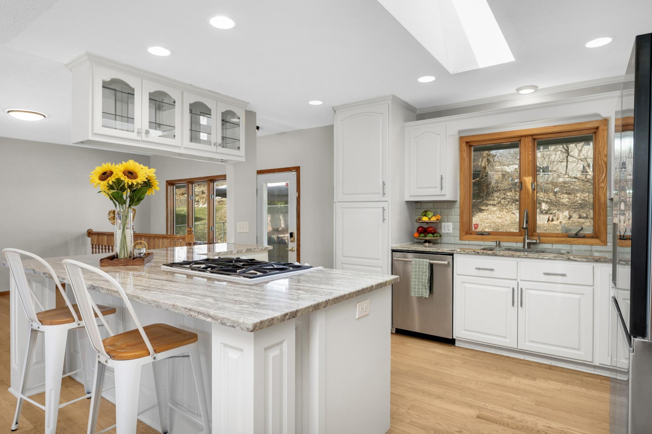 The moment you walk into this gorgeous sun-filled rambler, you’ll know this is the one. Blending classic mid-century charm with fresh modern updates, this Bloomington home offers a bright open layout, beautiful oak hardwood floors, fresh neutral décor, and thoughtfully updated spaces throughout. The stunning kitchen features white enameled cabinetry, sleek hardware, granite countertops, stainless steel appliances, and a stylish grey subway tile backsplash. A large center island with breakfast bar opens seamlessly to the dining and living areas, creating the perfect space for everyday living and entertaining. Skylights and recessed lighting add even more natural brightness to the home. The main level includes four spacious bedrooms, including a private primary suite with its own full bath. The finished lower level expands the living space with luxury vinyl plank flooring, a cozy gas fireplace, and a wet bar—ideal for movie nights, entertaining, or relaxing. The flexible lower level also offers space for a hobby space, workout room, or Storage. Situated on a mature lot in a quiet Bloomington neighborhood, this home offers space, style, and versatility in a fantastic location.