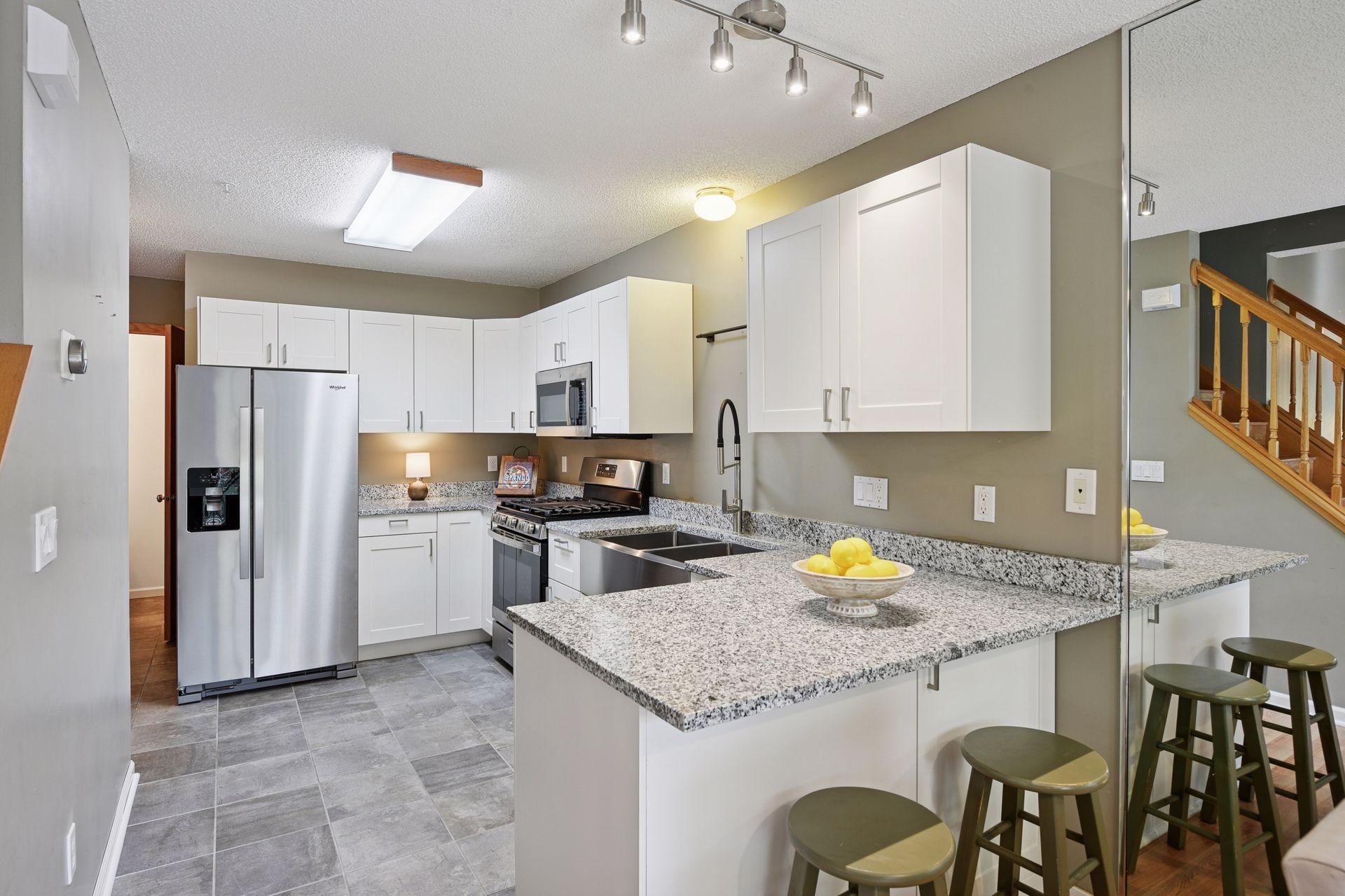 If you’re looking in Chanhassen for a townhome that feels private but keeps you close to everything, this Mission Hills end-unit stands out. Every window faces trees instead of neighbors, giving you rare privacy in a townhome setting, plus south-west light that fills the home throughout the day. Inside, the main floor has wood laminate plank floors (new in 2021), an open layout, and a white kitchen remodeled in 2021 with granite countertops, stainless steel appliances (2024), and a huge stainless-steel sink. The kitchen connects to the dining and living areas under two-story vaulted ceilings, making the space feel bright and open. Cozy gas fireplace makes the home feel extra inviting. Upper level offers 2 generously-sized bedrooms, a full bathroom with a long vanity, walk-in closets, and an office/flex space—ideal for working from home or a hobby room. Laundry is conveniently located on the upper level with newer LG washer and dryer and shelving storage. The southern facing patio offers tons of privacy and greenery views. Garage has epoxy flooring! Located just off Highway 212, you’re minutes from downtown Chanhassen, shops, restaurants, parks, and trails. HOA replaced roof (2022), HOA replaced siding (2023), Full kitchen remodel with main level flooring and trim (2021), New Anderson windows in upper level (2022), upper level luxury vinyl plank flooring (2022), AC replaced (2024), Water Heater replaced (2024). This home is totally move-in ready!