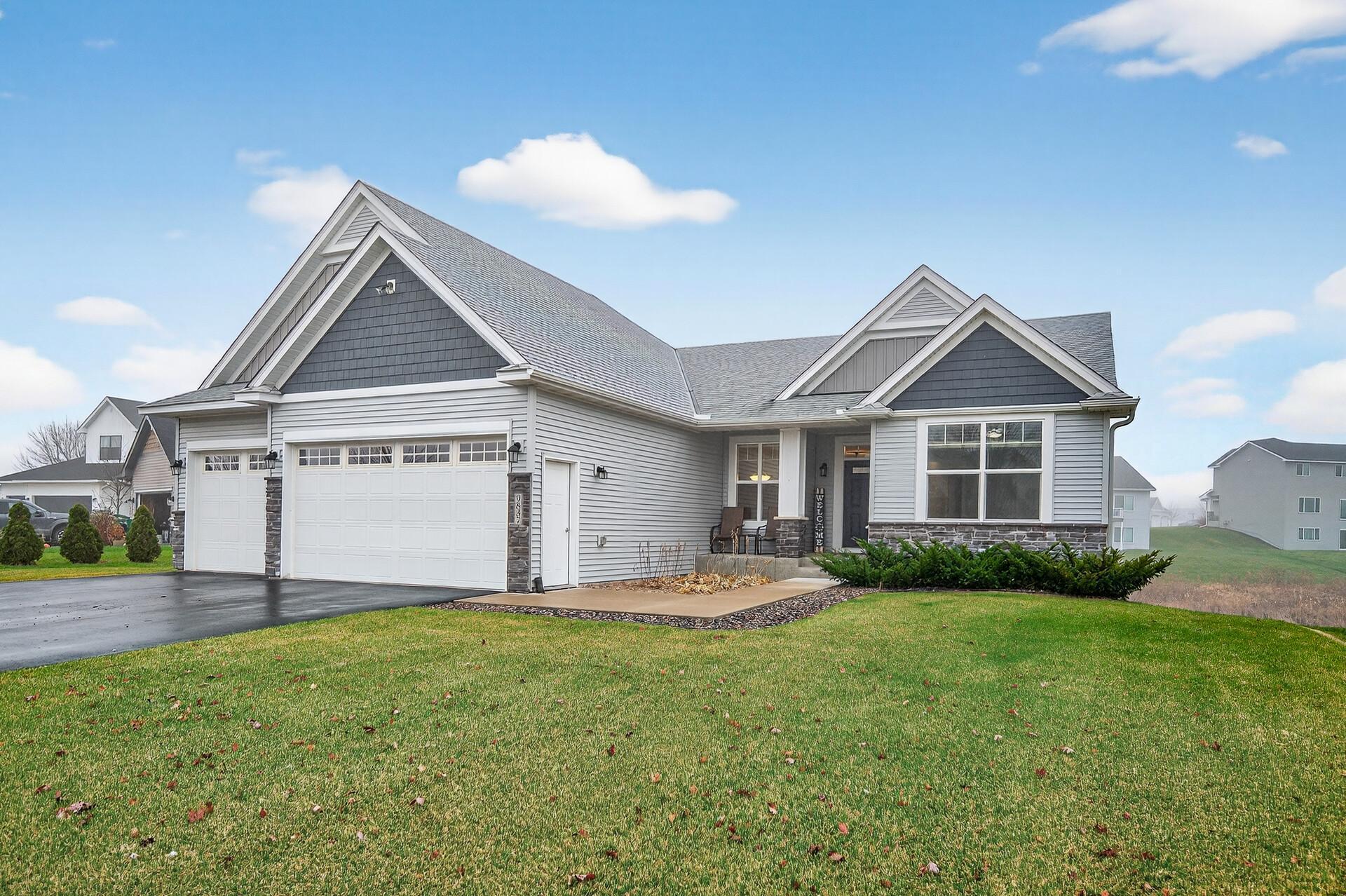 Fall in love with effortless one-level living in this 2019 Hanover rambler, perfectly set beside a serene backyard pond. The bright main floor features three bedrooms, including a welcoming primary suite with walk-in closet, dual sinks, and a 3/4 bath. Main-level laundry makes everyday life easy. Enjoy LVT flooring throughout with carpet in the bedrooms, ceiling fans, a cozy gas fireplace, and a stylish kitchen with under-cabinet lighting, pantry, and stainless appliances. Step through the patio door to a spacious deck—ideal for morning coffee or sunset dinners—overlooking the pond and newer retaining wall. The walkout lower level is sheetrocked and ready to finish by adding a 4th bedroom and family room, already wired with heat runs in place, plus a finished 3/4 bath and great storage. Three-car garage and a newer roof round out this move-in-ready gem. This home is better than new construction and ready for you to settle in! Schedule your private tour before it is too late.