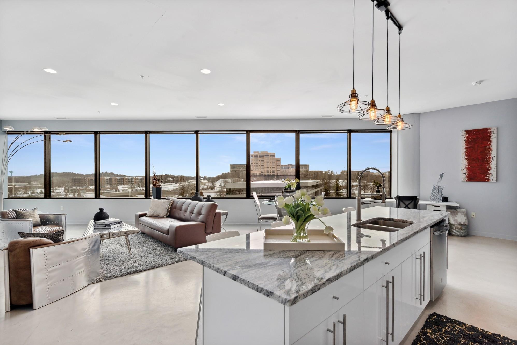 Live in luxury with captivating views! This sophisticated 6th-floor condo masterfully blends modern industrial aesthetics with luxury comforts, offering an elevated urban lifestyle defined by its stunning southern views and expansive open-concept design. Step into a sun-drenched sanctuary featuring 10-foot ceilings and a striking wall of six-foot windows that frame the skyline. The interior boasts a contemporary edge with polished concrete floors and solid wood doors, creating a sleek and durable living space. The gourmet kitchen is a chef's dream, equipped with: Granite countertops and a stylish backsplash. High-end Samsung touchscreen refrigerator. Gas stove, conventional oven, and dishwasher for seamless entertaining. The primary suite offers a spa-like retreat with a double vanity, a standalone shower, and a deep soaking tub. This unit includes 2 parking spaces in covered parking garage and pet friendly building offers two outdoor patios, gym, bike storage, onsite manager. Association fee includes Direct TV, Fiber Optic Internet, water, garbage, building amenities, gas, lawn/snow, hazard insurance, onsite management. OWner pays only for electric.