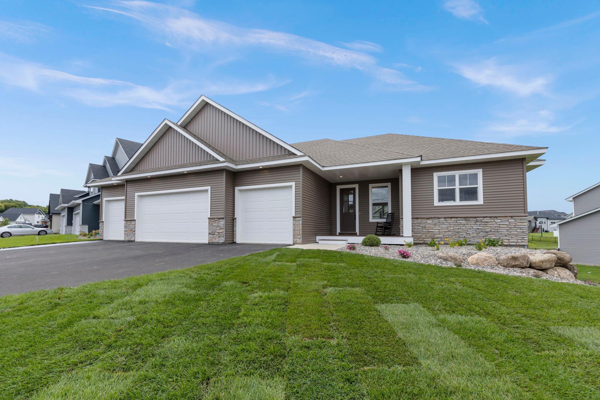 Welcome to the Magnolia III, an exquisite custom-built rambler by Stone Cottage Construction in the Berres Ridge community of Lakeville. This thoughtfully designed home offers 5 bedrooms, 3 baths, and a finished walkout basement, combining luxury and functionality. The open-concept main floor features 10-ft ceilings, engineered hardwood floors, and a stunning kitchen with a large center island, soft-close cabinetry, quartz countertops, gas range with hood vent, and wall oven. The adjacent dining area flows into a spacious great room with an electric fireplace — perfect for entertaining. The main-floor primary suite is a private retreat with a spa-like ensuite bath, dual quartz vanity, tiled walk-in shower, private toilet room, and direct access to a walk-in closet and laundry room. A second main-level bedroom offers flexibility as a guest room or home office, serviced by a full bath. The finished lower level includes a large family room, 3 additional bedrooms, a full bath, and access to the backyard. Enjoy outdoor living on the front porch with TimberTech maintenance free decking, beautiful landscaping with irrigation, and a spacious 4-car garage. A truly exceptional home with high-end finishes throughout! Stone Cottage is a custom builder with various options. Model Hours: Fridays 3-6pm, Saturday & Sunday 11-4pm.