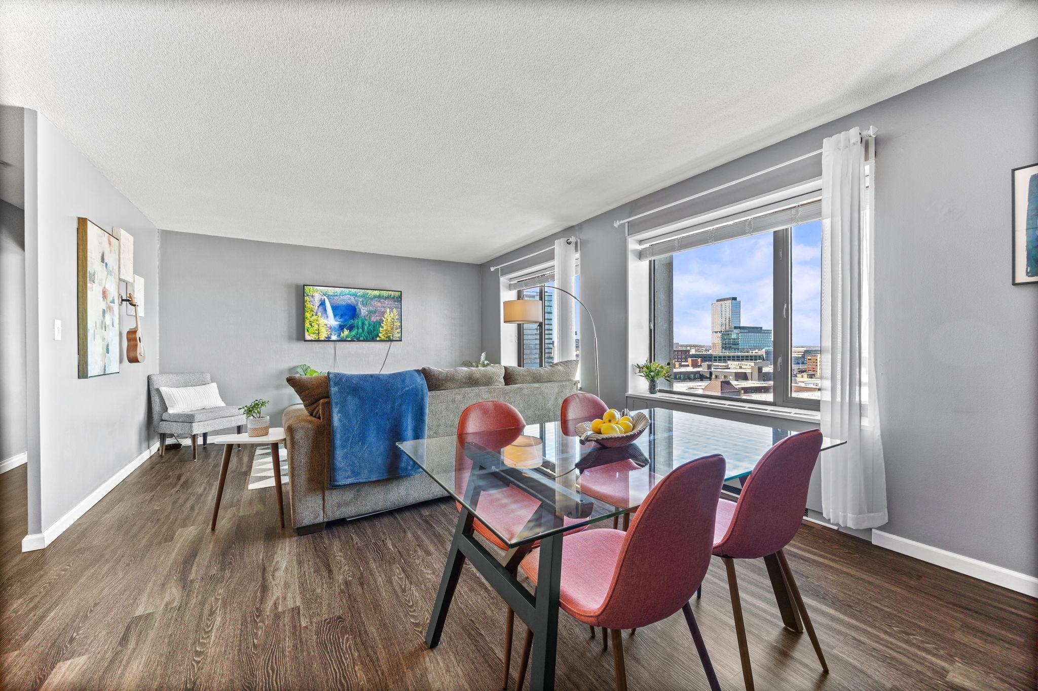 This modern one-bedroom condo is on the 15th floor and offers an exceptional urban living experience with stunning West facing sunset skyline views, and incredible Mississippi riverfront access. The open-concept layout features large windows that fill the space with natural light, creating a bright and airy atmosphere. The kitchen is equipped with contemporary finishes, including stainless steel appliances and beautiful quartzite countertops, perfect for both cooking and entertaining. The spacious bedroom provides a peaceful retreat with panoramic city views. The Towers feature uniquely large outdoor spaces for downtown living, such as an oversized pool, bathhouse, year round grills, patio tables, and private tennis courts. Also including indoor amenities, with a fitness center, sauna, rooftop lounge, library and computer room, modern indoor lounging spaces, and a covered front entry. You will enjoy the ultimate downtown convenience and luxury living. Don't miss the opportunity to own a piece of the Minneapolis skyline in one of the most desirable locations that is walkable to both Downtown and the North Loop, and is also conveniently located less than 1 block to Whole Foods and Starbucks.