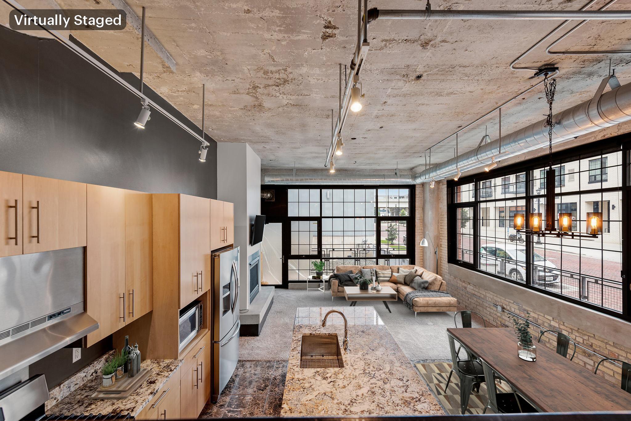 Huge corner 1BR + Den walk-out at Bookmen Lofts in the heart of the North Loop! This historic loft features high ceilings, exposed brick, gas fireplace, walls of windows with tons of natural light, and a large private patio. Kitchen includes large island with bar seating, stone countertops, stainless steel appliances, gas oven, and ample cabinetry. Enjoy true loft living with great space for relaxing or entertaining. Bookmen Lofts offers a community patio, exercise room, secure access, indoor heated parking, and pet relief area. Live just steps from Target Field, Target Field Station, the Mississippi riverfront, and the North Loop’s top restaurants, shopping, fitness studios, and nightlife.