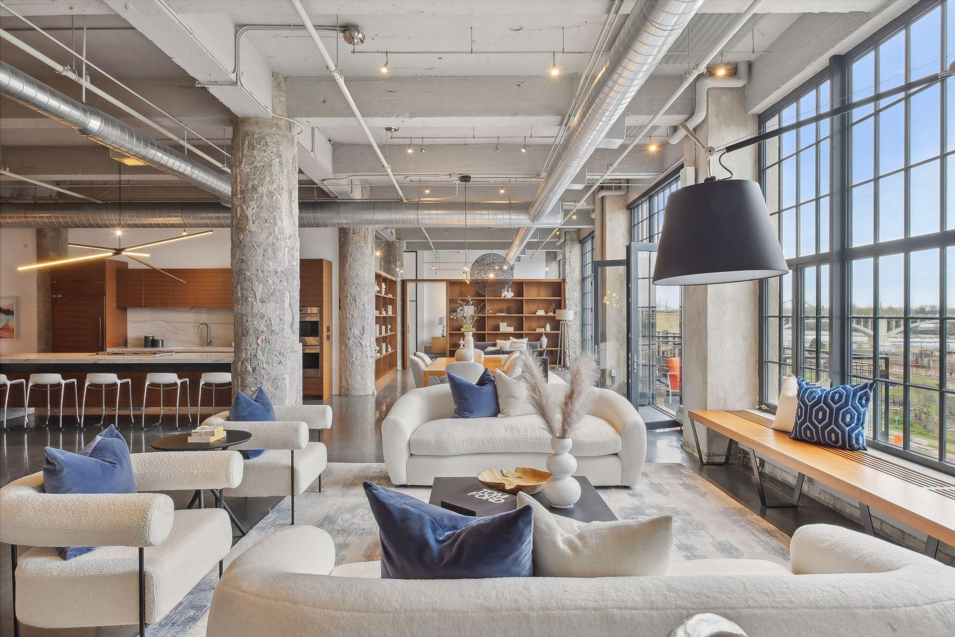 Within the historic Washburn Lofts a spacious home on the third floor is now available. The condo has been completely customized by the award winning MSR Design and Branson Builders. The home flows smoothly to maximize the stunning riverfront views overlooking the iconic Stone Arch Bridge from storefront windows and a spacious private terrace. The owners suite features a dressing room, en suite bathroom with heated floors, office, and a second private terrace. Throughout the home are other elegant elevated touches, including a steam shower, media room, gourmet kitchen, butler's pantry, and wet bar including additional beverage fridge, dishwasher, and ice maker. 3 parking stalls and 2 private storage rooms are included. Washburn Lofts is ideally located, walking distance to riverfront trails, Guthrie Theater, nationally recognized restaurants, and all the best of downtown. Don't miss a rare opportunity to own an important piece of Minneapolis history!