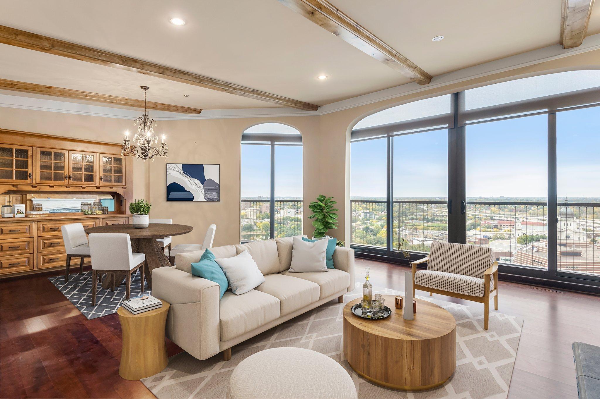 Welcome to 1201 Yale Place, Unit 2303, a luxurious penthouse condo in the heart of Minneapolis offering one bedroom and one-and-a-half bathrooms. This home is defined by its high-end finishes throughout, with meticulous attention to detail in every corner. The expansive floor-to-ceiling windows in both the living room and bedroom provide breathtaking views of the city, particularly during sunset. The open floor plan seamlessly connects the living, dining, and kitchen areas, which are all located on the upper level. The large kitchen features stainless steel appliances, a walk-in pantry, and breakfast bar seating, flowing effortlessly into the dining room and living room, making it perfect for casual dining and entertaining. The living and dining areas boast beautiful built-ins, while gorgeous beams draw the eye to the vaulted ceilings, adding elegance and character to the space. A gas-burning fireplace in the living room enhances the cozy atmosphere. The spacious bedroom suite is located on the lower level, offering huge walk-in closets and a spa-like bathroom with a walk-in shower for ultimate relaxation. The laundry room is conveniently located on the lower level as well, providing ease and efficiency in daily living. This multi-level condo also includes top-tier building amenities such as 24-hour security, an indoor pool, a library, a gym, tennis courts, and a beautifully maintained garden and courtyard. The location is incredibly walkable, placing you just steps from Minneapolis' premier attractions such as the Walker Art Center, Sculpture Garden, Loring Park, Orchestra Hall, and Nicollet Mall. You're also within walking distance of Target Field, U.S. Bank Stadium, and Target Center. With its premium finishes, remarkable views, and exceptional building amenities, this penthouse offers a rare opportunity for luxury living in one of the city's most vibrant areas.
