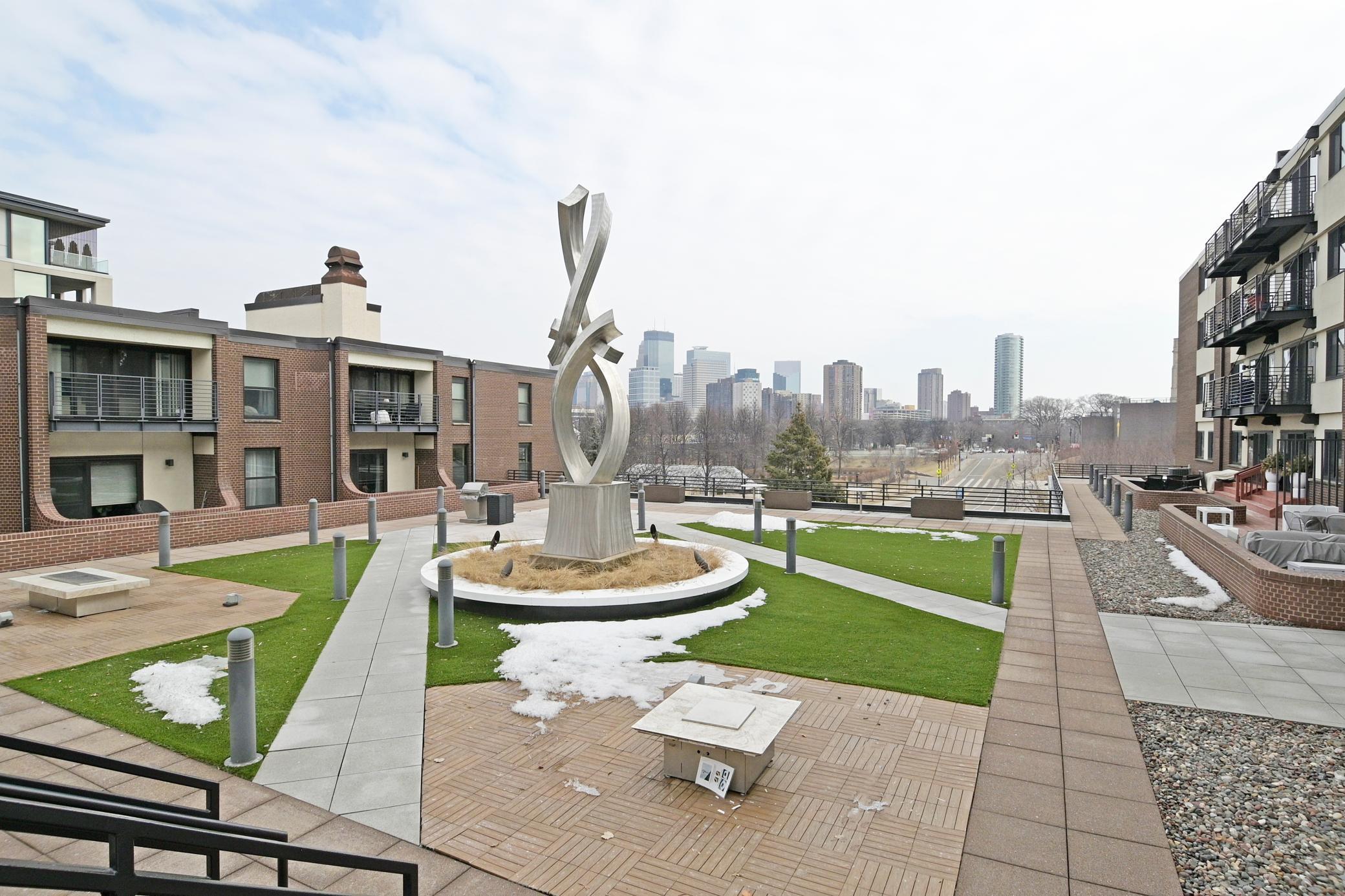 Welcome to Groveland Terrace. This bright, thoughtfully updated 855 sq ft residence is ideal for a single professional or couple seeking low-maintenance living with extraordinary views. Enjoy morning sun and panoramic skyline vistas from your private deck overlooking the Minneapolis Sculpture Garden, Walker Art Center, and Loring Park. Recent updates include new flooring and carpeting (2026), stainless steel appliances (2025), fresh paint throughout, popcorn ceiling removal, added entry closet, and updated light fixtures. The spacious bedroom suite offers a ¾ bath, in-unit laundry, and a floor-to-ceiling patio door leading directly to the deck. Two underground parking stalls and a dedicated storage unit add exceptional value and convenience. Association dues provide comprehensive coverage — including heat, water, internet/cable, amenities, exterior maintenance, and more — with owners responsible only for electricity, offering simplified monthly budgeting. Residents enjoy premium amenities including a heated courtyard pool, fire pit, outdoor lounge seating, party room, exercise room, sauna, and guest parking — all in a prime location near lakes, dining, trails, and major freeway access.