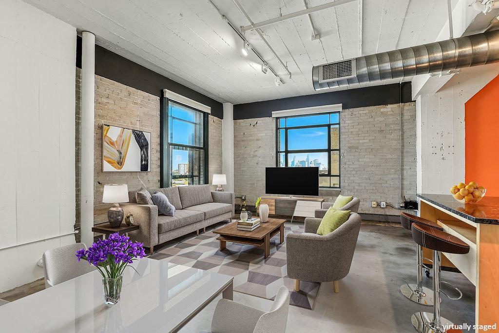 Sweeping downtown skyline views from 9th floor corner 2 bedroom, 1 bathroom condo at the Chicago. See supplements for lots of great information! A lifestyle with everything you need is here at the Midtown Exchange Building! Global Market for good eats, exercise room to work it off, media/game room for chillin’, rooftop patio and grill with full glass super chic party room – full kitchen, TV, dining, and lounge spaces. 2 car garage stall spaces and storage! Spacious open floorplan with high ceilings 2 bedroom unit yet flex on use of rooms! Beautiful kitchen with moveable center island which is so versatile for prep or dining. Granite counters, loads of cabinetry and storage, black finish appliances! Large living/great room leaves space for dining as well while overlooking the panoramic views of Downtown Minneapolis! Owner’s bedroom offers plenty of room for a king bed and additional furniture, plus a large walk-in closet with organizers! Double pocket bard doors add style! 2nd bedroom can be a flex space. Full bath is stylish, too! LVP flooring in bathroom, new shower fixtures, and cool blue vanity. Laundry closet with stack LG units. Solid interior doors! Honeywell smart thermostat, Google smart bulbs, new water shut offs for kitchen and bathrooms, and metal baseboards unique for design. Omni-directional shades and full wall Ikea unit included. Come stay, come play, come relax and live…the Chicago awaits!