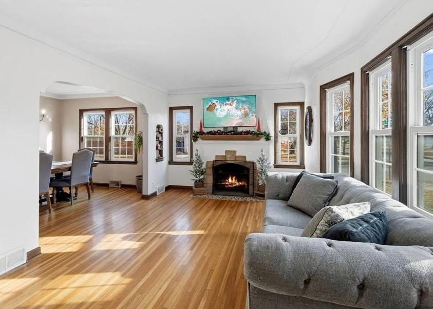 Charming English Tudor on Victory Memorial Drive in Minneapolis with direct access to miles of walking and biking trails. This classic 4BR/3BA home offers timeless character with thoughtful updates, including a rare wine room. The main level features hardwood floors in the living room, dining room, and bedrooms, a wood-burning fireplace, updated kitchen, dining room with built-in buffet, and two main-level bedrooms. The upper level is dedicated to a spacious owner’s suite with hardwood floors, full bath, and flexible sitting area or home office. The finished lower level includes a family room, fourth bedroom, ¾ bath, and wine room. Enjoy the private, fully fenced, beautifully landscaped backyard with an 18x15 concrete patio and storage shed, ideal for entertaining. Major updates include a new roof (2024), new A/C (2025), new washer, dryer, and refrigerator (2025), garage door opener (2025), and newer maintenance-free Andersen windows.