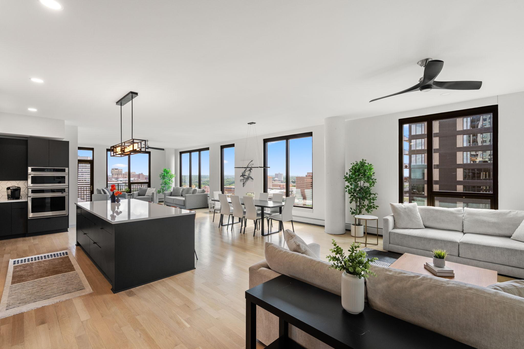Experience urban living at its finest in this top floor residence at Legacy Lofts, where sophisticated design meets thoughtful upgrades throughout. This is an exceptional opportunity to own one of the most desirable homes in the building, offering unmatched value at this price point. With south and west exposures, this rare three bedroom, three bath corner home is filled with natural light and offers an open, airy feel throughout, highlighted by beautiful white oak flooring. Designed for both comfort and entertaining, it offers two spacious living areas and an open concept layout with floor to ceiling windows, a custom dry bar, and seamless flow between the kitchen, dining, and living spaces. The chef’s kitchen features an oversized quartz island, custom tile backsplash, GE Monogram appliances, upgraded cabinetry, and designer lighting. Bedrooms are thoughtfully separated for privacy, including an owner’s suite with dual walk in closets and a well appointed private bath with designer selections. Includes two premium, oversized parking spaces conveniently located near the elevator. Residents enjoy resort style amenities such as a rooftop deck with lawn bowling, outdoor pool, hot tub, sauna, fitness center, game room, golf simulator, and elegant community room. Additional conveniences include 24 hour staff, secure access, heated parking, storage, pet spa, and car wash. The building also offers conference rooms, rotating art exhibits, a library, and a gated playground. All of this is just steps from Gold Medal Park, US Bank Stadium, the riverfront, Guthrie Theater, and premier dining, creating a lifestyle of true sophistication in the heart of downtown.