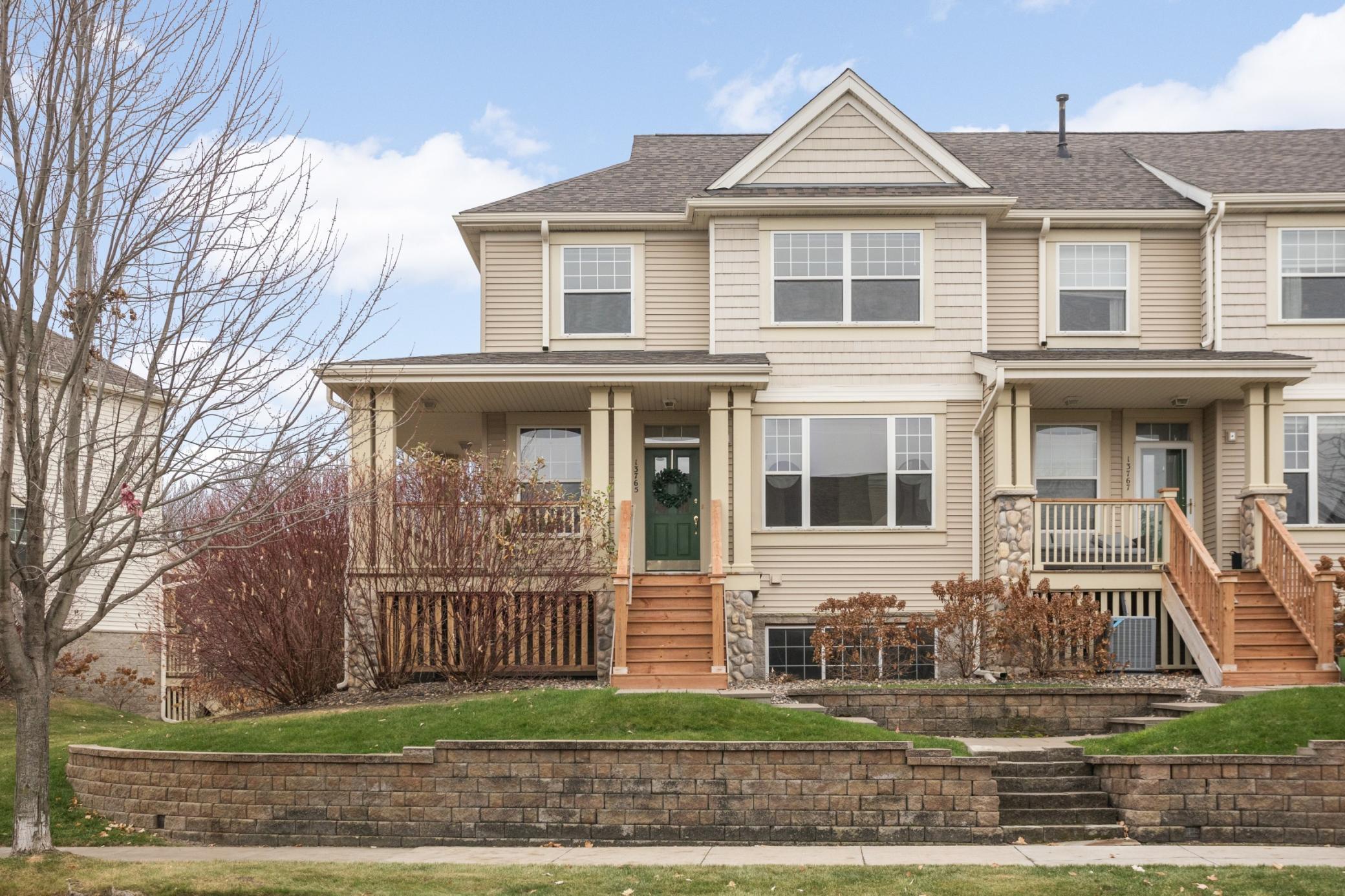 Welcome to this beautifully maintained end-unit townhome offering exceptional natural light, modern updates, and incredible curb appeal. With a charming front porch overlooking the landscaped grounds, this home immediately welcomes you in. Step inside to a bright and open main level featuring oversized windows, neutral paint, and a seamless flow between the living and dining spaces. The large wraparound porch extends your living area outdoors perfect for morning coffee or evening relaxation. The spacious kitchen offers generous cabinet storage, stainless steel appliances, a center island, and plenty of prep space for cooking and entertaining. Upstairs, the primary suite includes a private bathroom with dual sinks, a soaking tub, separate shower, and a walk in closet. Additional bedrooms are well-sized with great natural light. Outside, enjoy maintenance-free living with a beautiful sidewalks, and well-kept landscaping surrounding the property. Updates include new roof (2023), new siding (2024), new kitchen appliances (2022) new furnace (2022) and a new water softener (2022). This home combines comfort, space, and a fantastic location—ideal for anyone seeking a bright, move-in-ready townhome with modern conveniences and charm throughout.