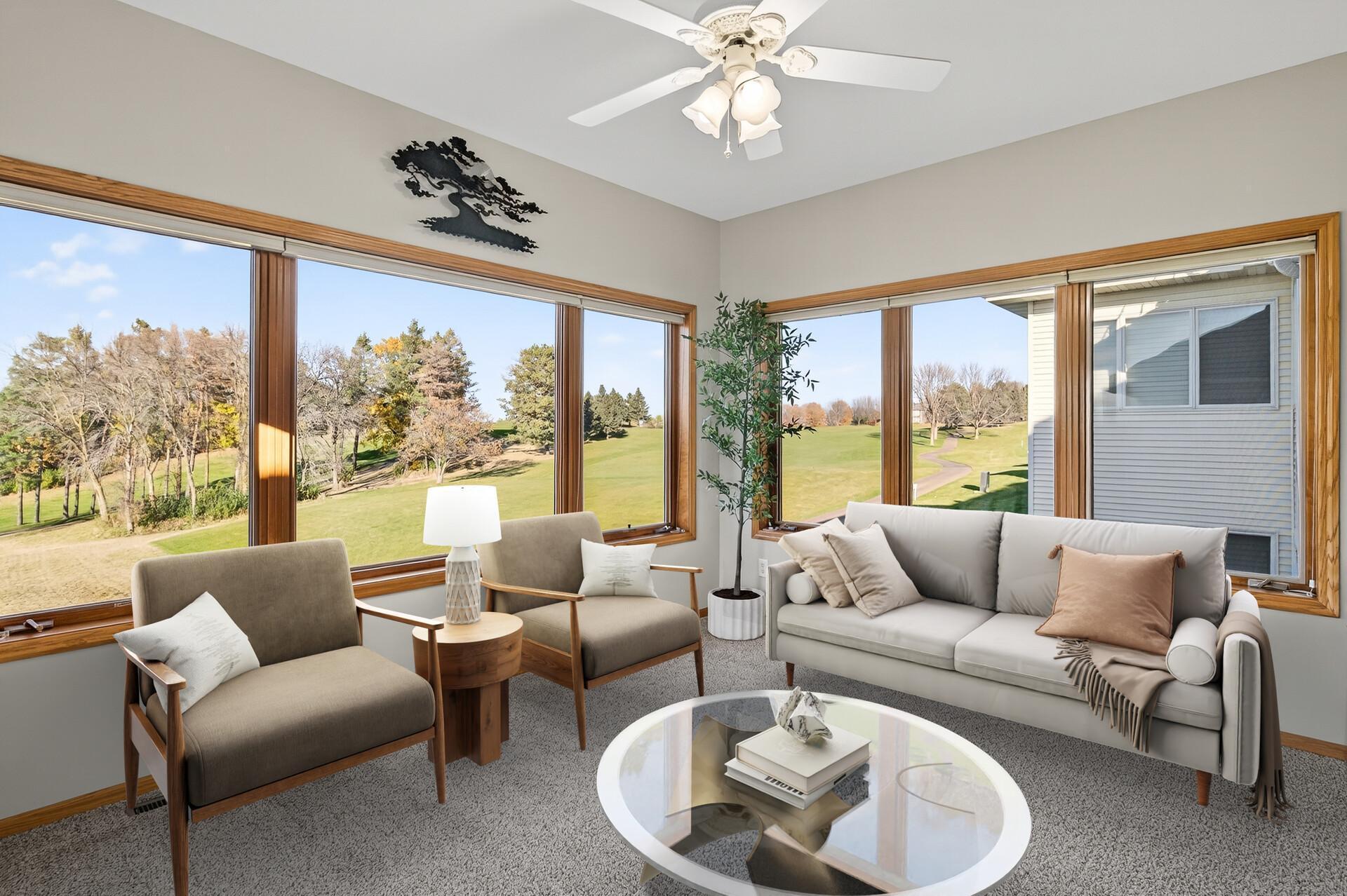 Beautiful Detached Townhome on The Wilds Golf Course! Located in the highly desired Sterling South area of The Wilds, this stunning home offers easy one-level living situated on the 12th tee, with breathtaking views of Mystic Lake and the 11th hole of The Wilds Golf Course. Enjoy beautiful sunsets and peaceful surroundings right from your backyard! Inside, you’ll find new quartz countertops, upgraded appliances, and stylish finishes throughout. The open main level features a welcoming family room with a cozy fireplace, a spacious primary suite with its own fireplace, walk-in closet, and private en suite, plus an office and a versatile second bedroom or flex room. The walkout lower level adds even more space with a large family room featuring a third fireplace, a finished flex room for workouts or hobbies, and ample storage. Additional highlights include a new composite deck, new patio door, and a fully finished garage with epoxy flooring. Just minutes from Mystic Lake, The Wilds Golf Club, and all the shops, dining, and entertainment in downtown Prior Lake — this home offers the perfect combination of comfort, convenience, and incredible views!
