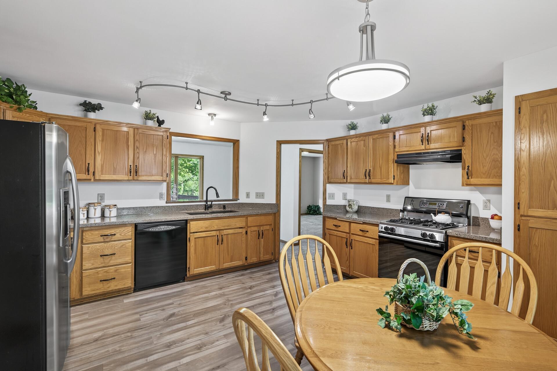 The seller just spent more than $13,000.00 having a new Lennox high efficiency furnace (97%) and air conditioning unit put in that will save you money down the road on utility bills! Check out this inviting one-level home nestled on a spacious 0.58-acre lot with 4 bedrooms, 3 baths, 2 car garage attached & 1 car garage detached, 2,308 sq. ft. finished. Solid surface counter tops, pantry cabinet, SS/Black appliances and new LVP flooring, in the kitchen. Vaulted living room and new carpeting on the main level. Two bedrooms on the east wing of the main level with a bathroom in between the bedrooms. Primary suite with ¾ bathroom and walk-in closet in the west wing of the main level. Main floor laundry with new LVP flooring. Updated atrium door to the walkout basement and freshly painted recreation room & bedroom #4. Cozy family with new carpeting and corner wood burning fireplace with stone facade. Basement full bath with jetted tub & separate shower. Separate storage room from the utility room. Asphalt driveway leading you to the single detached garage and workshop. Insulated and heated with a wood stove. Deep backyard that backs up to a serene creek—perfect for nature lovers and privacy seekers. Relaxing front floating deck. Come find out why you want to make this your home!