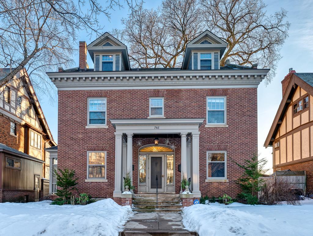 Splendid brick home on a glorious Crocus Hill block w/ bluff view. Classy with a modern fresh vibe. Comfortable, inviting spaces throughout. Main level family/tv room. Rich natural woodwork, stunning leaded windows and lots of built-in bookcases. Great natural light throughout. Delightful kitchen with upscale appliances and lighting. Living and dining rooms are beautiful and can accommodate large gatherings and cozy evenings by the fire. The back porch will be everyone's favorite warm weather relaxation spot. 4 second floor bedrooms and stunning primary suite on 3rd floor with a lavish bathroom and great closets. Bathrooms on all levels. Finished play space and office in lower level. Wonderful, South facing backyard with thoughtful landscaping. This home has a unique tunnel to a 2-car garage on St Clair. One block to Linwood Park, and a few blocks to the Grand Ave shops and restaurants. What a glorious place to call home!